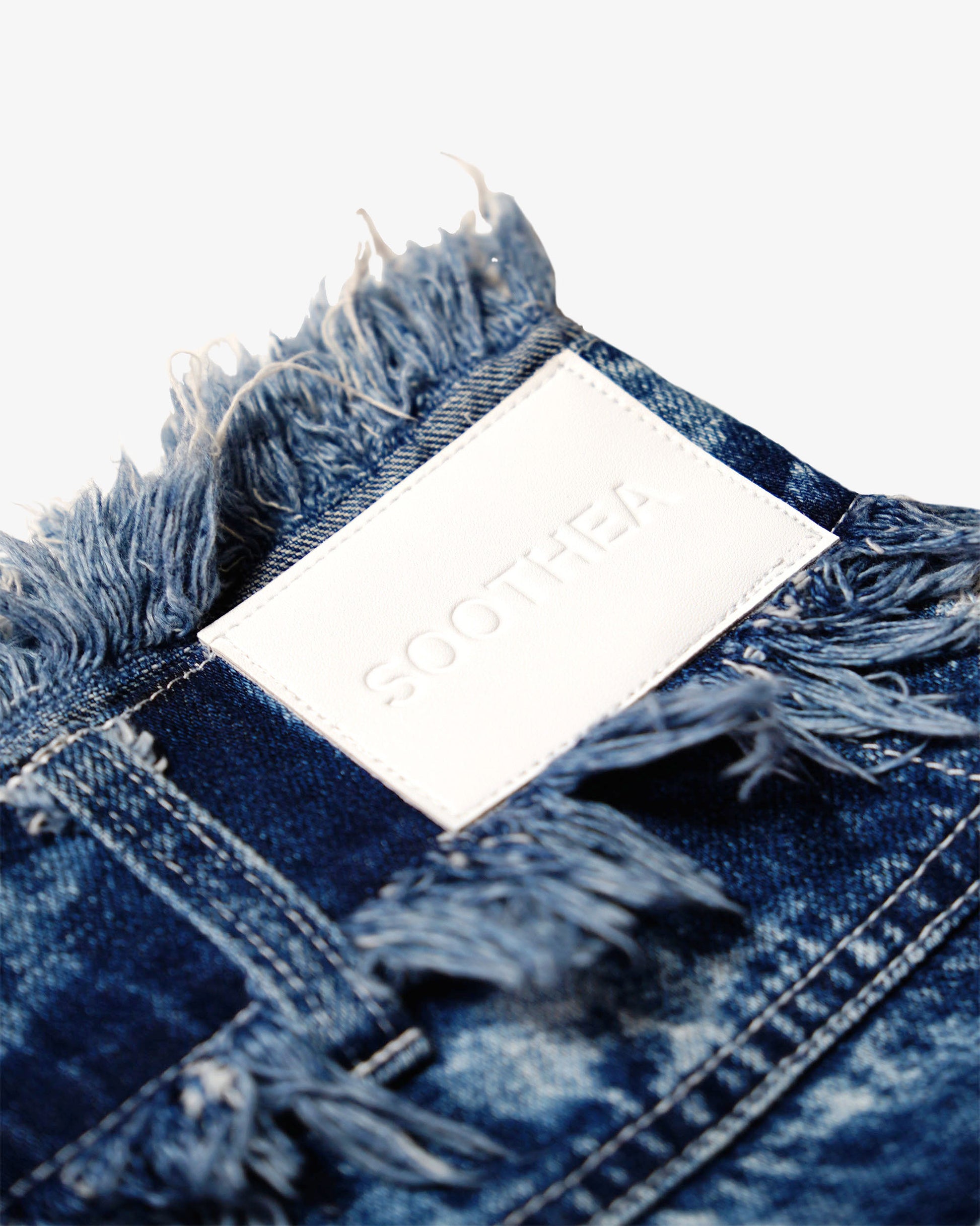 大胆なブリーチ加工と力強いフリンジディテールのデニムスカート。